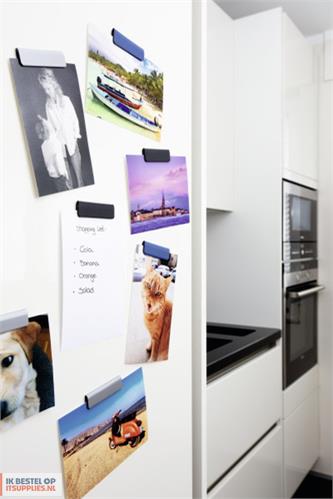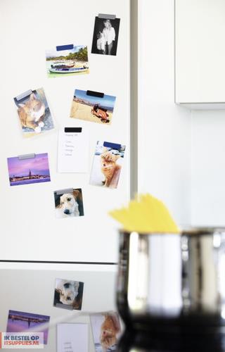 Zelfklevende magneetklem voor het ophangen van kleine notities. Kleef de magneet op het door u gekozen oppervlak, open de klem, plaats de notitie en sluit de klem. Met DURAFIX hangt u supersnel notities op.