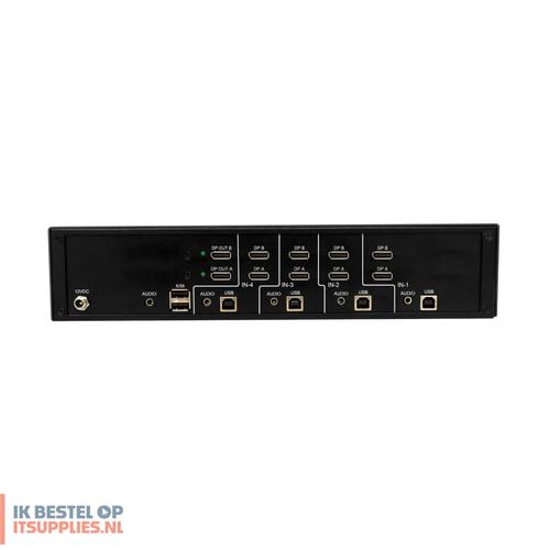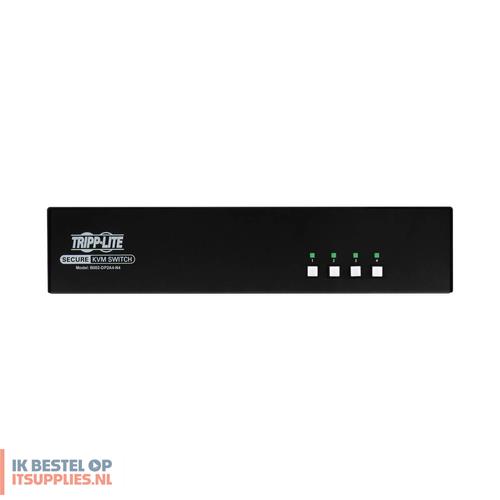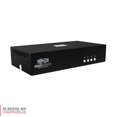 Tripp Lite B002-DP2A4-N4. Aansluiting toetsenbord: USB, Aansluiting muis: USB, Aansluiting video: DisplayPort. HD type: 4K Ultra HD, Maximum resolutie: 3840 x 2160 Pixels, Videobandbreedte: 30 Hz. Kleur van het product: Zwart, Materiaal behuizing: Metaal, Snoerlengte: 1,5 m. Stroombron: DC, Ingangsspanning: 100 - 240 V, AC-ingangsfrequentie: 50 - 60 Hz. Certificaten van naleving: RoHS