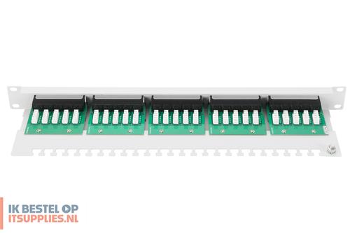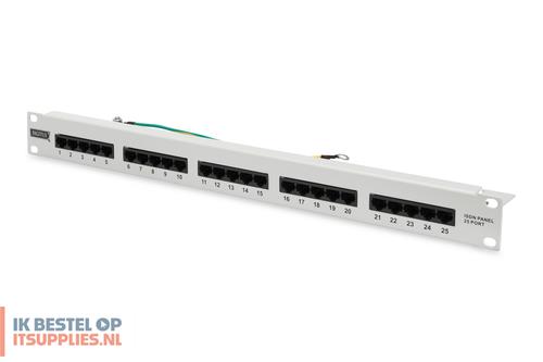 Digitus DN-91325-1. Aansluiting(en): RJ-45, Ondersteundende kabel types: Cat3. Kleur van het product: Grijs, Montage: Rekmontage, Rackcapaciteit: 1U. Breedte verpakking: 55 mm, Diepte verpakking: 515 mm, Gewicht verpakking: 1,45 kg. Land van herkomst: China