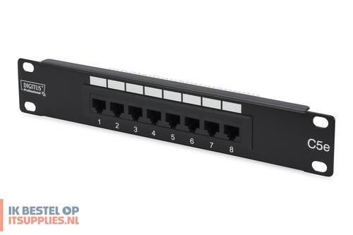 Digitus DN-91508U. Aansluiting(en): RJ-45, Ondersteundende kabel types: Cat5e. Kleur van het product: Zwart, Montage: Rekmontage, Rackcapaciteit: 1U. Certificering: EIA/TIA 568 ISO/IEC DIS 11801. Breedte verpakking: 285 mm, Diepte verpakking: 50 mm, Gewicht verpakking: 324 g. Land van herkomst: China