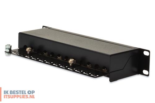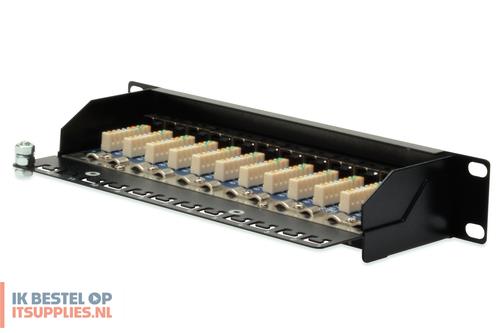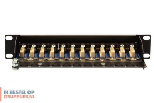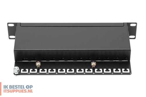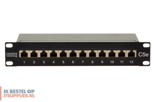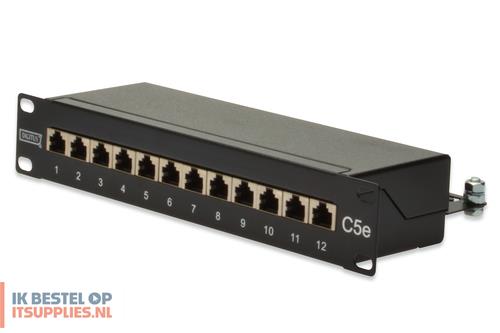 Digitus DN-91512S. Aansluiting(en): RJ-45, Ondersteundende kabel types: Cat5e. Kleur van het product: Zwart, Montage: Rekmontage, Rackcapaciteit: 1U. Certificering: EIA/TIA 568 ISO/IEC DIS 11801. Breedte verpakking: 285 mm, Diepte verpakking: 55 mm, Gewicht verpakking: 993 g. Land van herkomst: China