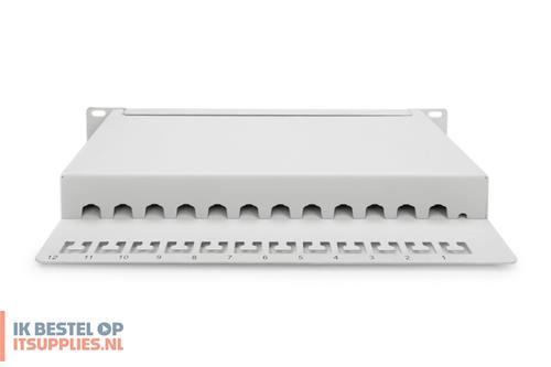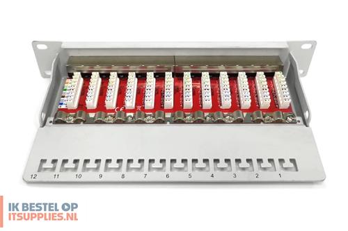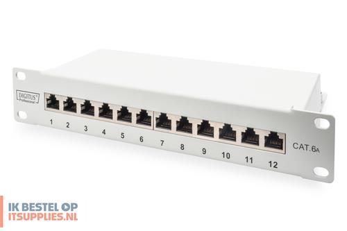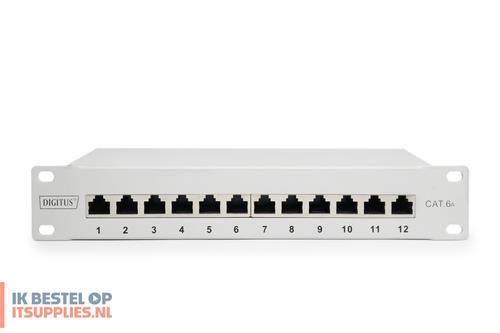 Digitus DN-91612S-EA-G. Ethernet interface type: 10 Gigabit Ethernet, Aansluiting(en): RJ-45, Ondersteundende kabel types: Cat6a. Kleur van het product: Grijs, Materiaal: Metaal, Montage: Rekmontage. Breedte verpakking: 60 mm, Diepte verpakking: 260 mm, Gewicht verpakking: 890 g. Land van herkomst: China