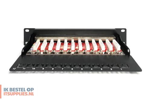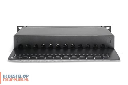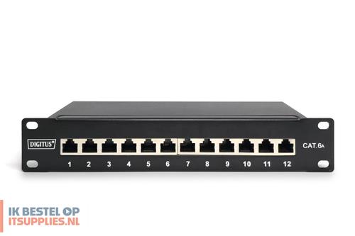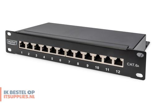 Digitus DN-91612S-EA. Ethernet interface type: 10 Gigabit Ethernet, Aansluiting(en): RJ-45, Ondersteundende kabel types: Cat6a. Kleur van het product: Zwart, Materiaal: Metaal, Montage: Rekmontage. Breedte verpakking: 60 mm, Diepte verpakking: 260 mm, Gewicht verpakking: 890 g. Land van herkomst: China