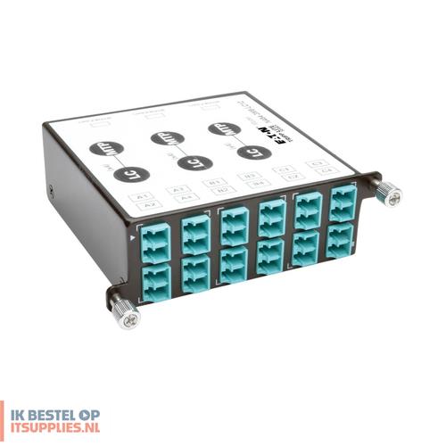 Tripp Lite N484-3M8-LC12. Netwerkstandaard: IEEE 802.3ae, Ethernet interface type: 40 Gigabit Ethernet, Maximale overdrachtssnelheid van gegevens: 40000 Mbit/s. Kleur van het product: Zwart. Breedte: 111,8 mm, Hoogte: 35,6 mm, Diepte: 94 mm. Breedte verpakking: 195,6 mm, Diepte verpakking: 149,9 mm, Hoogte verpakking: 40,6 mm. Land van herkomst: China, Producten per pallet: 1 stuk(s), (Buitenste) hoofdverpakking breedte: 396,2 mm