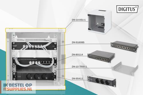 Digitus DN-10-SET-1. Soort: Wandrek, Maximale gewichtscapaciteit: 30 kg, Sleutelsleuf, Internationale veiligheidscode (IP): IP20, Kleur van het product: Grijs