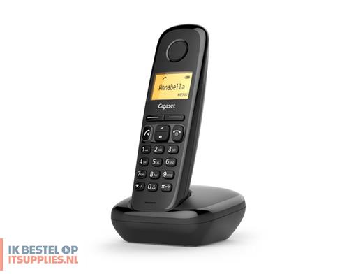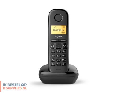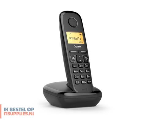 Gigaset A270. Soort: Analoge-/DECT-telefoon, Handset type: Draadloze handset. Luidspreker. Maximum indoorbereik: 50 m, Maximum outdoorbereik: 300 m. Capaciteit telefoonboek: 80 entries. Nummerherkenning. Beeldschermdiagonaal: 3,81 cm (1.5"). Kleur van het product: Zwart. Aantal handsets inclusief: 1