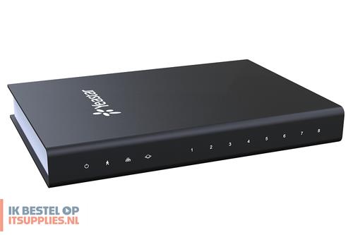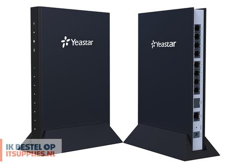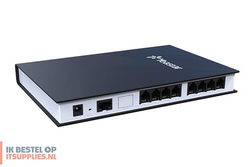 Yeastar TA800. Stemcodecs: G.711alaw, G.711ulaw, G.722, G.723, G.726, G.729A, GSM 6.10, Compatible met fax: T.38. Ondersteunde netwerkprotocollen: DHCP, DDNS, OpenVPN, PPPoE, Static Route, VLAN, Beheerprotocollen: RADIUS, TR-069. Spanning: 12 V, Output current: 1 A. Afmetingen (B x D x H): 137 x 200 x 25 mm